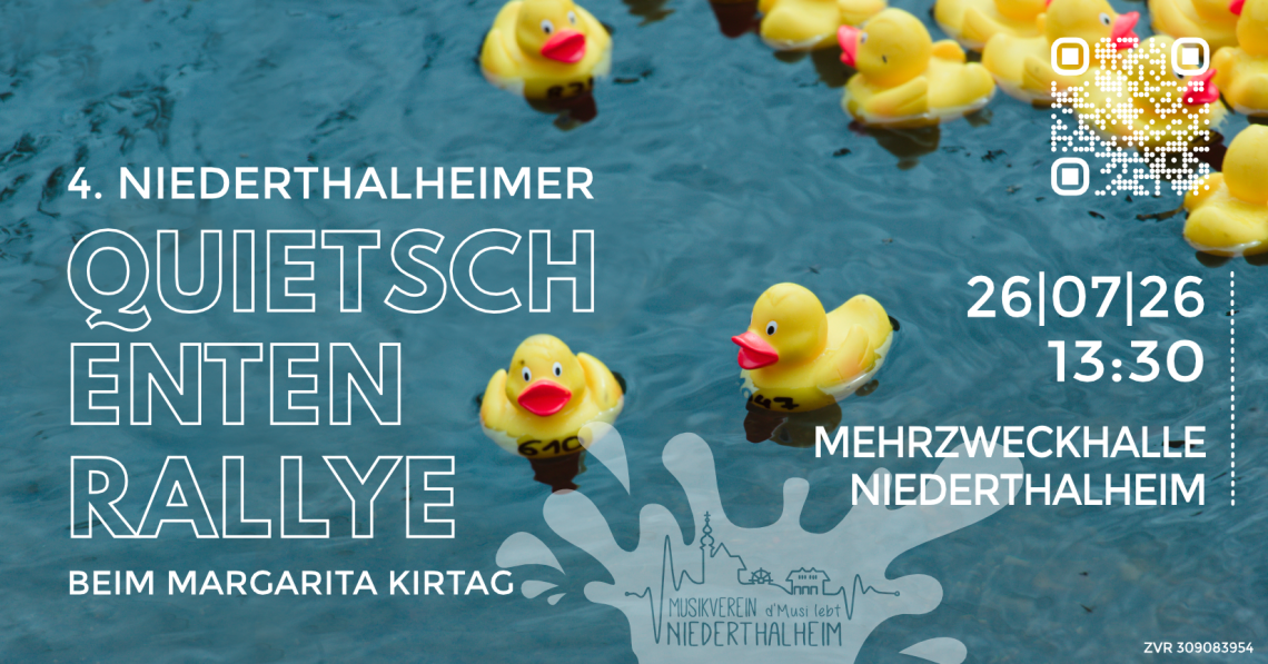 Soooo lange mussten unsere kleinen Quietschenten im Trockenen warten und nun dürfen sie bald endlich wieder plantschen. Lass dir den feucht-fröhlichen Spaß, bei dem der Kroißbach am Margarita Kirtag am 26. Juli 2026 zum vierten mal gelb „eingefärbt“ wird, nicht entgehen! Du hast noch Fragen? Die Antworten haben wir! 🦆 Wie kann ich mitmachen? Für jede Quietschente gibt es das dazugehörige Los und dieses kann bei allen Musiker:innen des MV Niederthalheim erworben werden. 1 Quietschenten-Los 3,00 € 4 Quietschenten-Lose 10,00 € 🦆 Was kann ich gewinnen? Geschmäcker sind ja bekanntlich verschieden und deswegen haben wir Preise keinem Platz zugeteilt. Das heißt der:die Besitzer:in des Gewinnerloses hat „die Qual der…